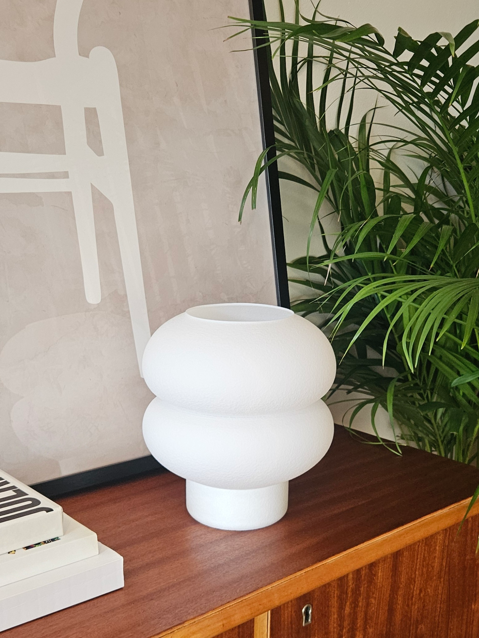 Minimalistisen pelkistetysti muotoiltu valaisin, joka antaa sisustuksellesi omalaatuisen ja tyylikkään ilmeen. Valaisimen yksinkertainen, mutta luova, pyöreä muotoilu yhdistyy pehmeään valoon, joka luo miellyttävän hajavalon laajalle huoneeseen. Valkoinen väri ja sulavat muodot kimaltelevat kauniisti auringossa tehden tästä valaisimesta täydellisen elementin osana sisustusta myös valoisaan aikaan.